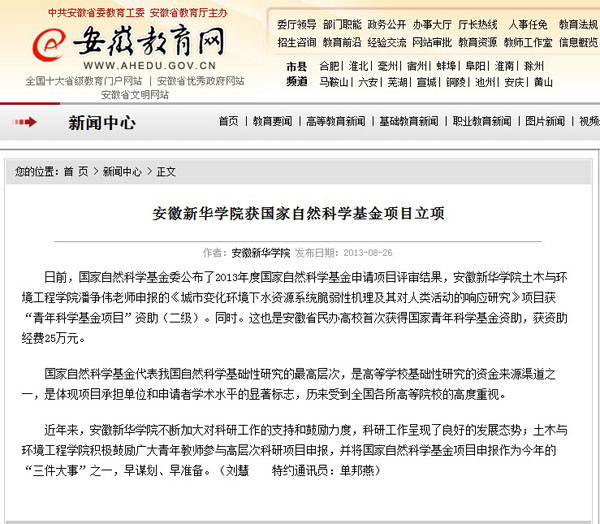 安徽教育网:必赢76net线路官网获国家自然科学基金项目立项