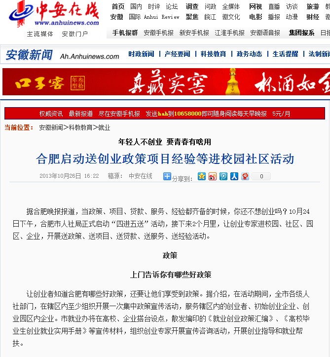 中安在线:合肥启动送创业政策项目经验等进校园社区活动