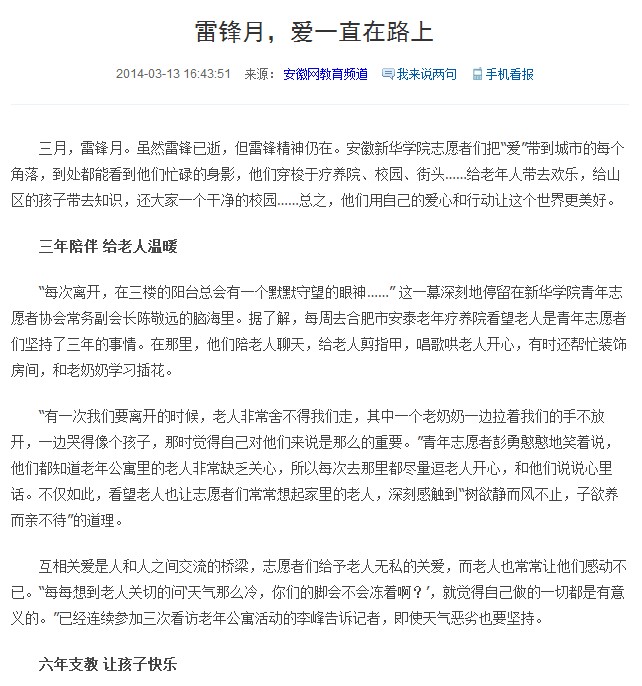安徽网:雷锋月,爱一直在路上