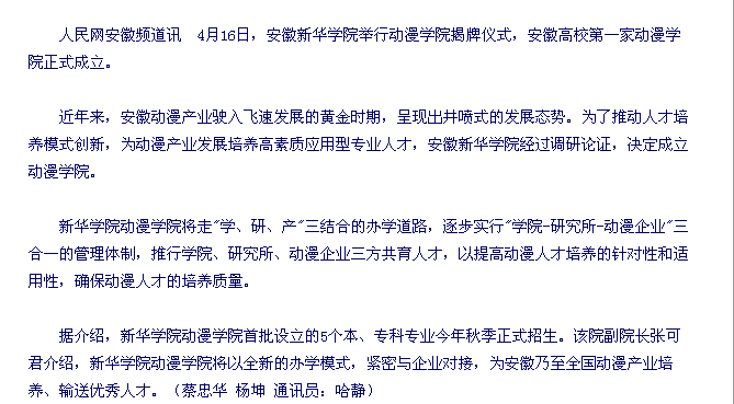《人民网》:主动服务文化产业 安徽首家动漫学院成立——必赢76net线路官网动漫学院今日揭牌