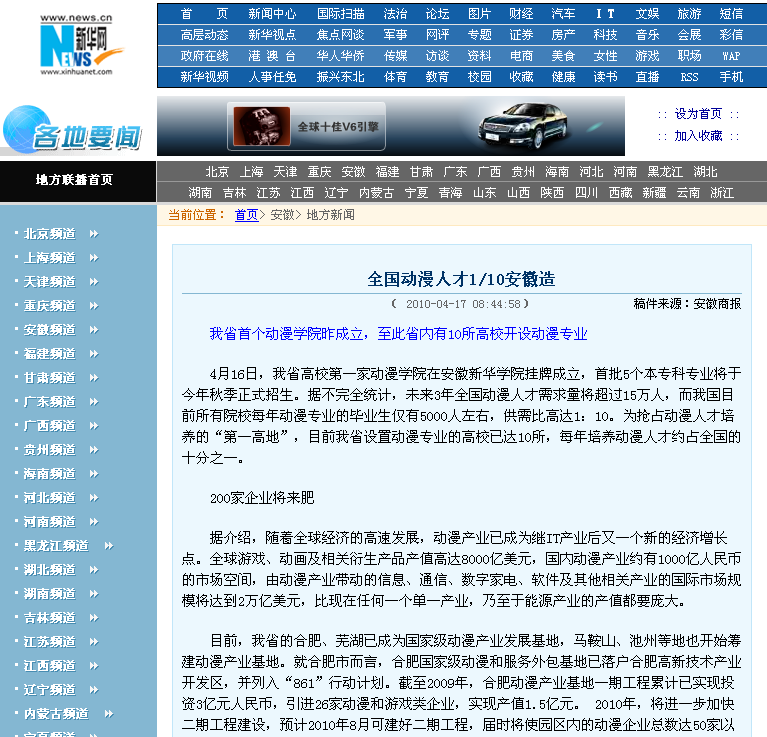 2010年4月17日,必赢网/各地要闻/安徽/地方新闻对我院动漫学院成立进行了相关报道。相关链接:http://www.xinhuanet.com/chinanews/2010-04/17/content_19545084.htm