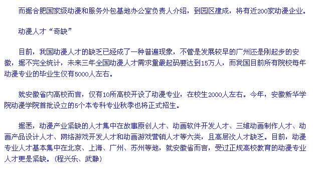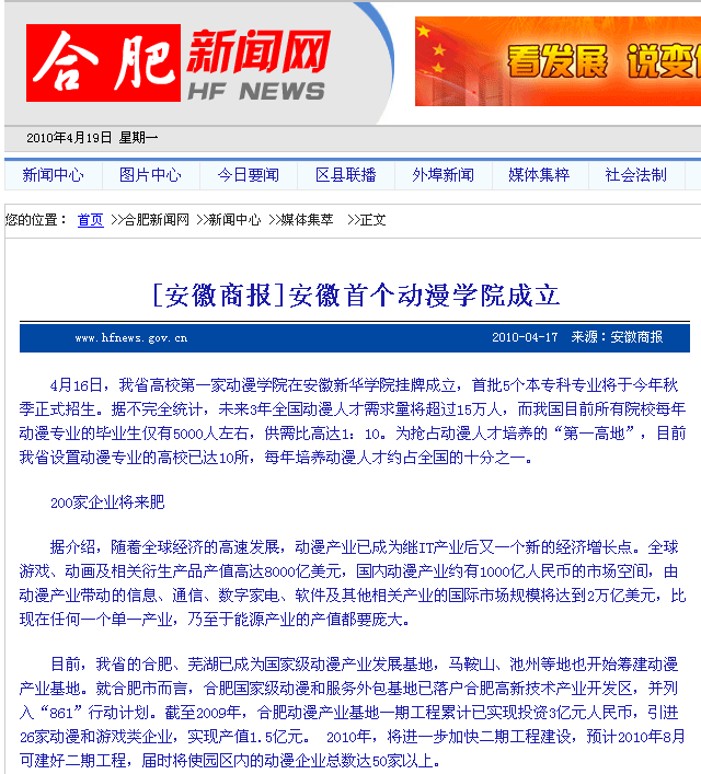 2010年4月17日,合肥新闻网/新闻中心/媒体集萃对我院动漫学院成立一事进行了相关报道。相关链接:http://www.ah.xinhuanet.com/hfnews/2010-04/17/content_19545465.htm