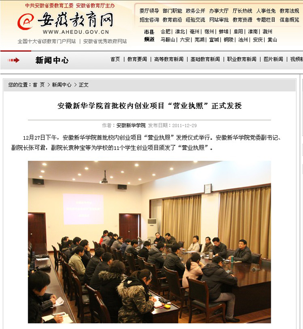 安徽教育网首页报道必赢校内创业项目“营业执照”正式发授